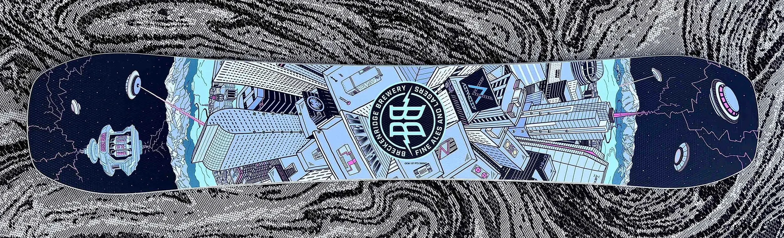 IN TIME FOR THE NOVEMBER 2025 LAUNCH, BRECKENRIDGE BREWERY AND NEVERSUMMER INDUSTRIES GAVE ME FULL CREATIVE CONTROL TO DESIGN THE NEW COLLAB SNOWBOARD, 12 OZ CAN, AND 12 PACK FOR THE FUNSLINGER LAGER AS WELL AS THE COLLABORATIVE LOGO. I OPTED FOR MY SIGNATURE CITY PLANET FEATURING DENVER. I INCLUDED MANY OF MY FAVORITE ICONIC ELEMENTS OF THE CITY IN THE DESIGN. THIS INCLUDES, MILE HIGH STADIUM, RED ROCKS, THE CASH REGISTER BUILDING AND MANY OF THE ICONIC 14K MOUNTAIN PEAKS.